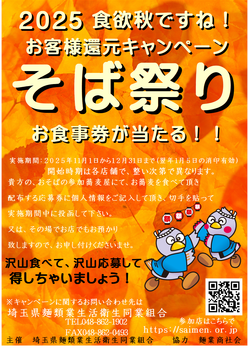 いつも組合加盟店へ、ご来店頂きましてありがとうございます。埼玉県麺類業組合(榎本一男理事長)では、秋の恒例行事となりましたそば祭りキャンペーンを開催致します。